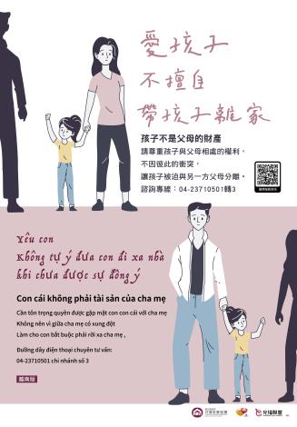 為利於新住民家庭理解諮詢、協尋等相關資訊及服務,兒童及少年遭父母、親屬擅帶離家失蹤,請撥打諮詢電話 04-22025399分機5(每週一至週五,09:00~18:00)。
