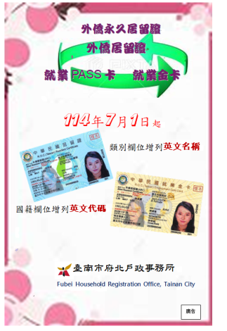 為求海外或駐臺外國機構人員及在臺不諳中文之外國人得以更易辨識移民署所核發之相關居留證件,爰自114年7月1 日起,外僑居留證、外僑永久居留證(含梅花卡、專案許可永久居留證)、就業PASS卡及就業金卡等證件之「類別」欄位增列證件英文全銜,且「國籍」欄位增列英文代碼,以資明確。業經核發且尚在效期內之證件仍屬有效,得繼續使用至效期屆滿日為止。本次修正樣本內政部移民署公告於該署網站 (https://www.immigration.gov.tw/5382/5385/7445/29919/393585/cp_news)。