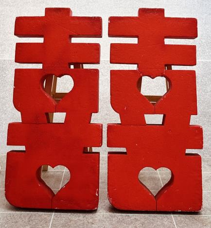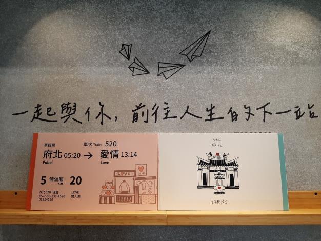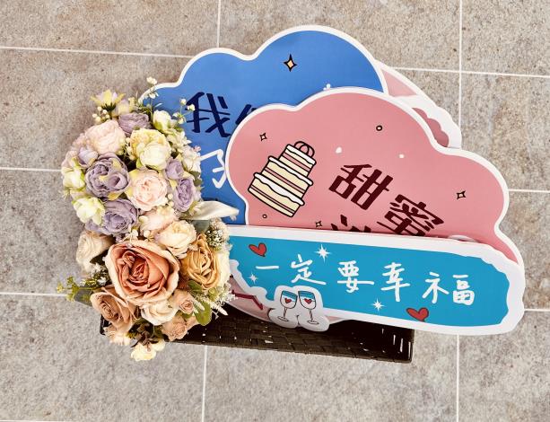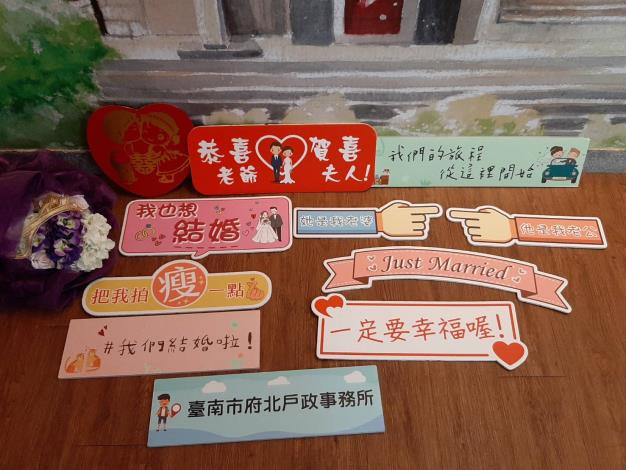 本所結婚牆搭配文創物件讓民眾拍照時使用,如幸福車票手拿板(520及1314幸福數字)、幸福站牌、文創幸福相框、花束、大紅囍字及Q版拍照手拿板。