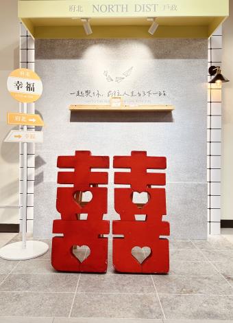 因火車站及轉運站位處北區,特聘請設計團隊於本所辦公廳舍內部,以火車站及轉運站作為結婚牆的主視覺(火車站+轉運站=代表人生不一樣的旅程)而衍生(主題:一起與你,前往人生的下一站),帶入設計元素及文創物品與配件的妝點(如站牌、人生列車的幸福車票),利用有限的小空間,拉出立體線條,完美的景中景設計比例,呈現出北區在地特色及兼具文青風格的結婚拍照牆,再輔以燈光的投射下,讓人猶如置身於在攝影棚內,享受不同於以往之拍攝體驗,新奇且溫馨。